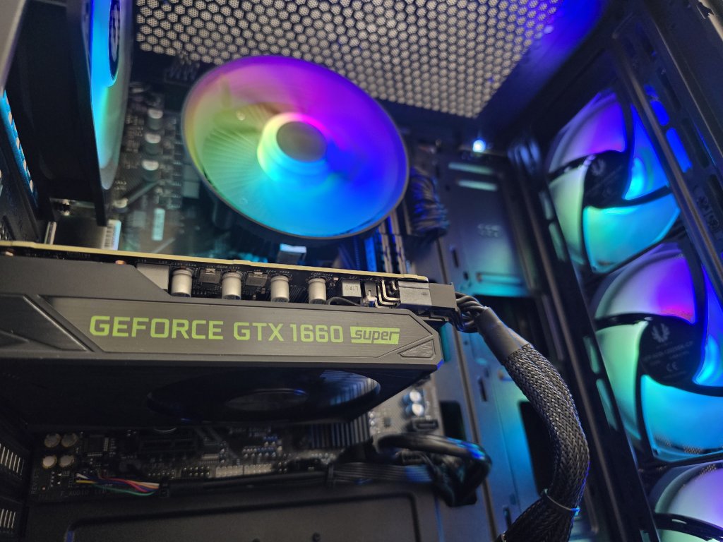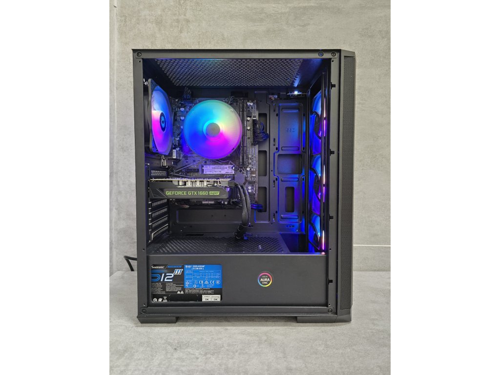 Specifikace:Procesor - Ryzen 5 5500Grafická karta - nVidia GTX 1660 Super 6GBOperační paměti - 2x8GB DDR4 3200MhzNVMe SSD - Patriot 512GBHDD - 500GB WDZákladní deska - Gigabyte A520MChlazení - AKASAZdroj - Seasonic 650W (80+ Bronz)Skříň - BitFenix (osazen 4x120mm ventilátor, plně nastavitelná barva podsvícení)Operační systém - Windows 11 PRO s licencí